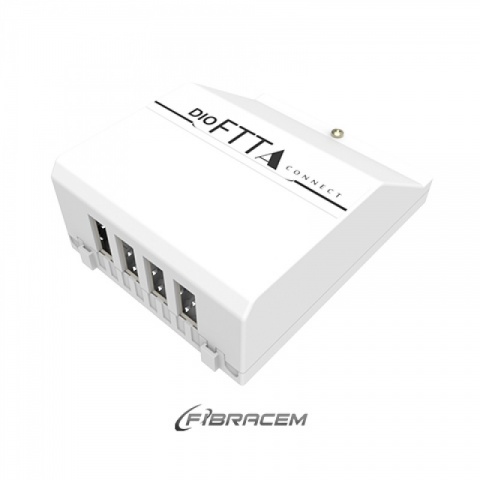 A caixa DIO FTTA Connect tem como função fazer o gerenciamento e fusão das fibras, splitters, cabos ópticos verticais e os cabos internos de assinantes. O conjunto fornece uma solução flexível, segura e de fácil instalação para a organização e manutenção de fibras. Indicada para instalações prediais de baixa densidade de cabos.